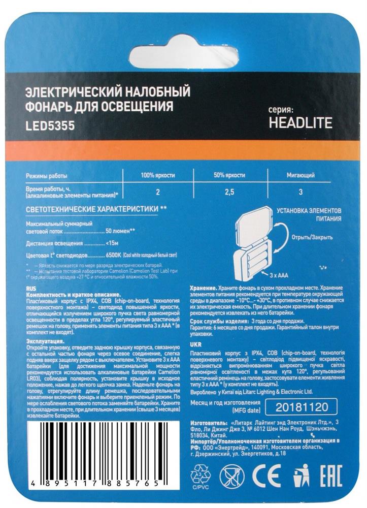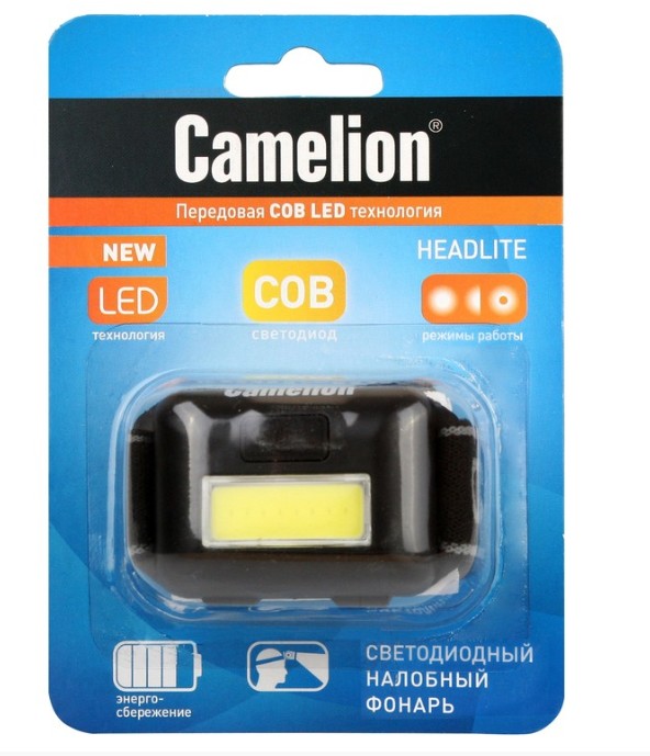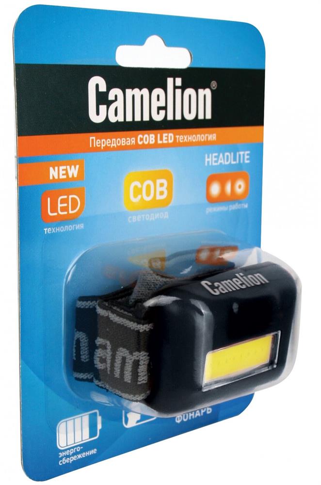 Фонарь "CAMELION" LED5355 (фонарь налобн, черн.,1Вт COB LED, 3 реж, 3XAAA, пласт, блист)