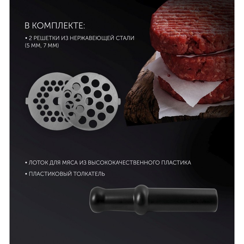 | Особенности (Мясорубки) | 2 решетки из высококачесвенной стали (5 мм, 7 мм) |