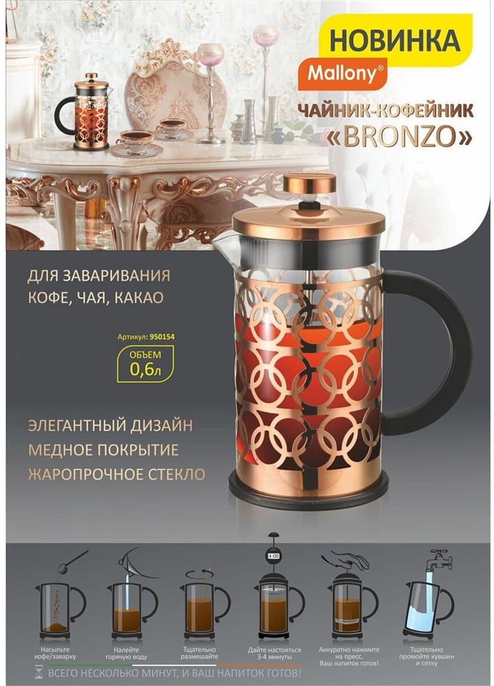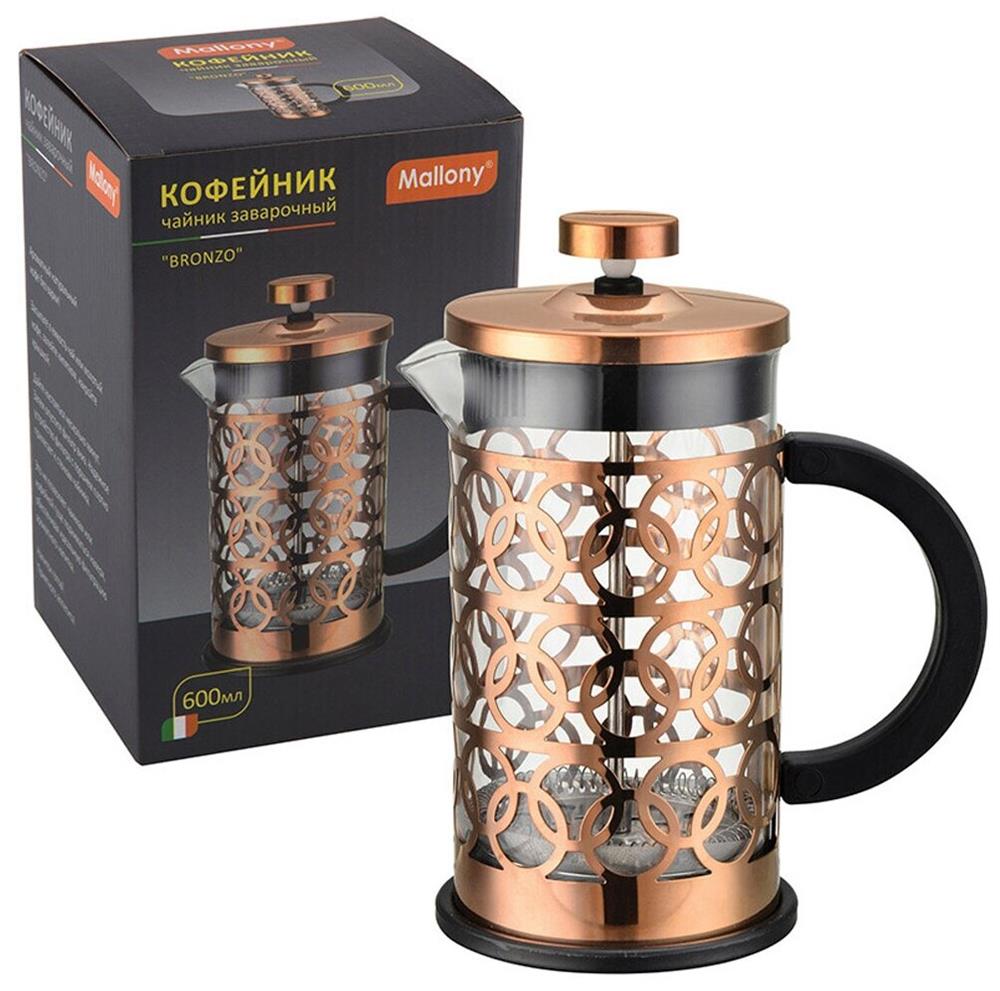 Чайник/кофейник "Mallony" (кофе-пресс), BRONZO, объем: 600 мл, из боросил стекла, корпус из нерж