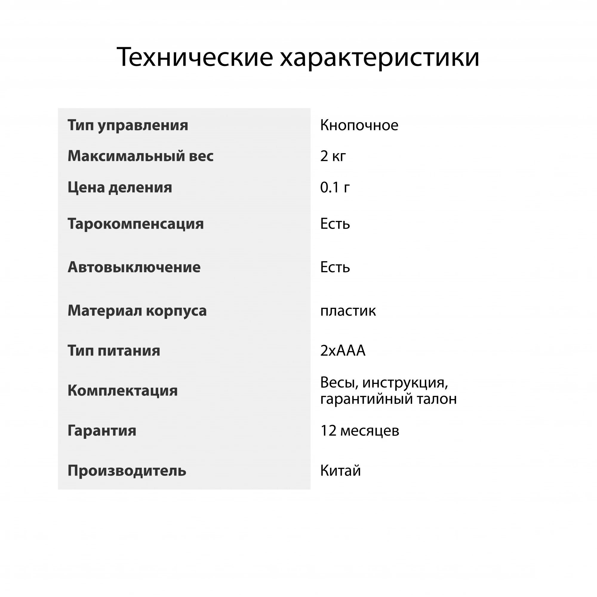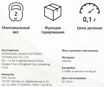 | Тип элементов питания (Кухонные весы) | AAA |